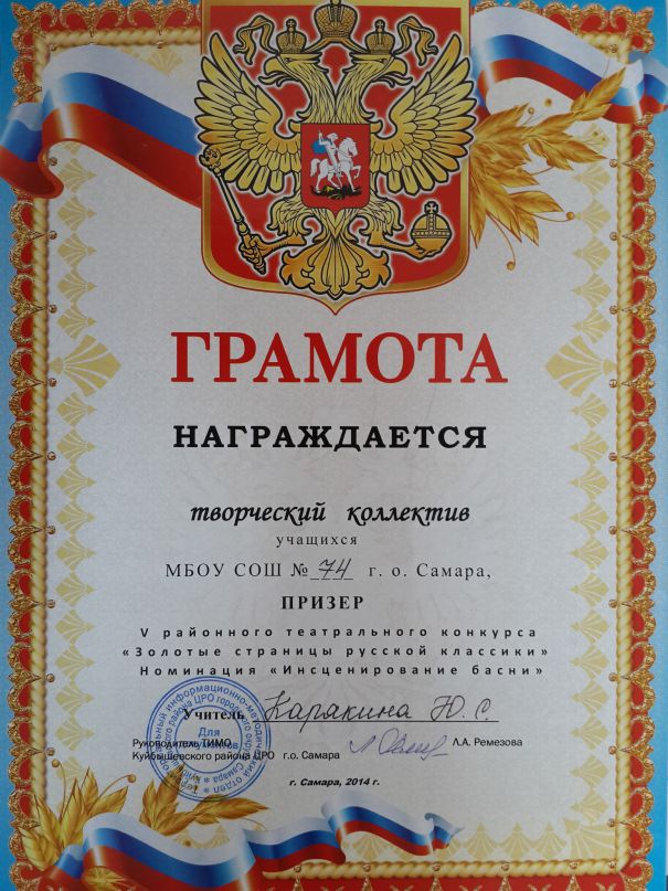 • 5 мая 2014 года творческий коллектив учащихся МБОУ СОШ № 74 г. о. Самара занял призовое место